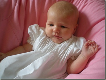 Her gown is one that my grandmother made for me when I was about 6 or 7 weeks old (Lynae is now 7 1/2 weeks old). I wore it for my infant baptism. Brianna also wore this gown for her dedication (she was 5 months old and it was pretty big on her).